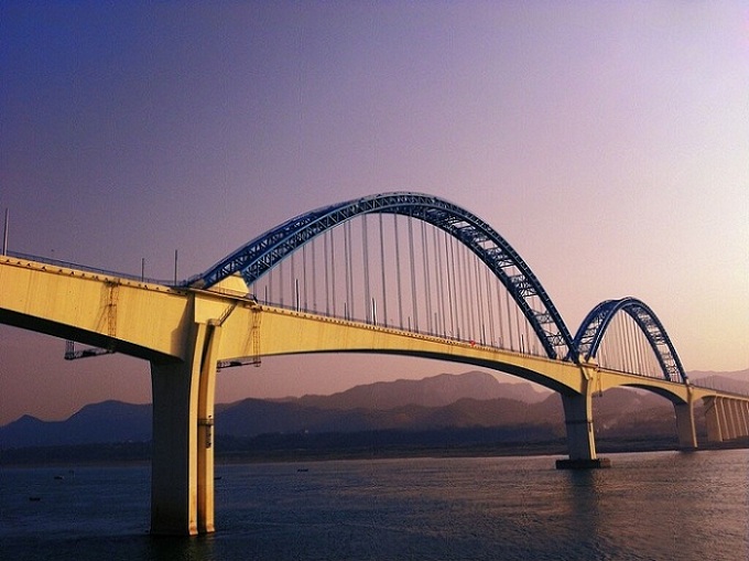 宜萬(wàn)鐵路宜昌長(zhǎng)江大橋位于宜昌港煙收壩水域,全長(zhǎng)2527米,橋面設(shè)計(jì)為雙軌道,主梁連續(xù)剛構(gòu)跨徑達(dá)275米,在同類型鐵路橋中位居全國(guó)第一。拱肋計(jì)算跨度264米,為目前國(guó)內(nèi)鐵路最大跨度的鋼管混凝土拱。